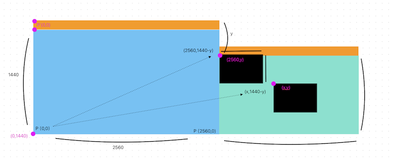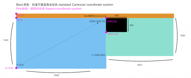 - 主屏(2560×1440),左下角原点(0,0),副屏(1920×1080),左下角原点(2560,360)。