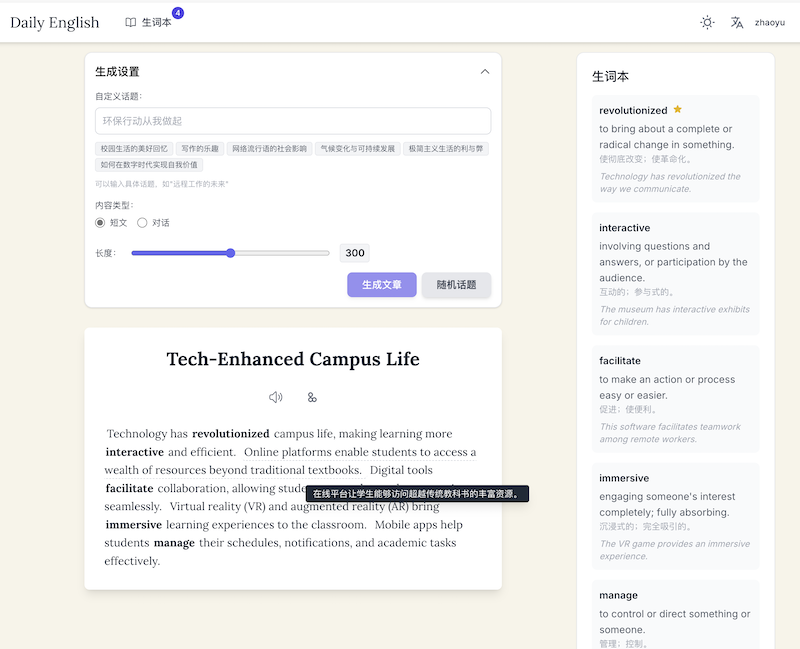 笔者是一名全栈偏后端的工程师。最近使用体验AI编辑器,写了一个简单的每日英文短文背诵小网站。