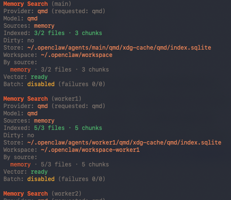 OpenClaw 会在 ~/.openclaw/agents/<agentId>/qmd/ 下维护一个独立的 QMD home,启动时初始化 QMD manager,定期运行 qmd update + qmd embed(默认每 5 分钟)。