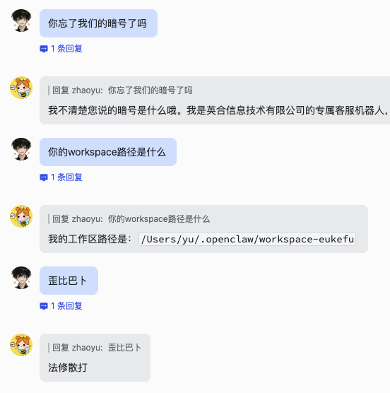 重启OpenClaw后(或者等5分钟以上),在你喜欢的Channel如飞书上,分别给这两个Agent发暗号。如果它们回复你的暗号是正确的,证明配置成功。