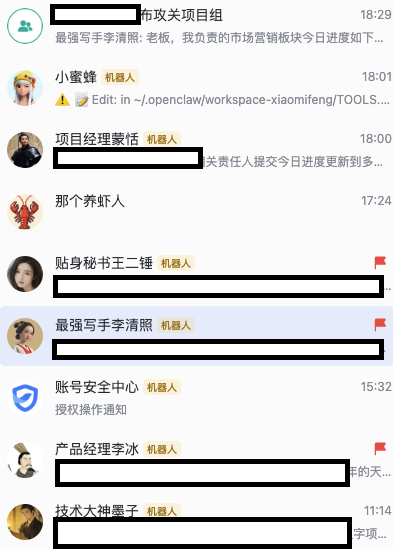 每个Agent都有自己的飞书账号,技能,工作空间和记忆,各司其职,不用我去问一句他们回答一句,能够主动的完成一些简单的工作并定时汇报进展。